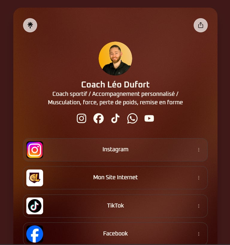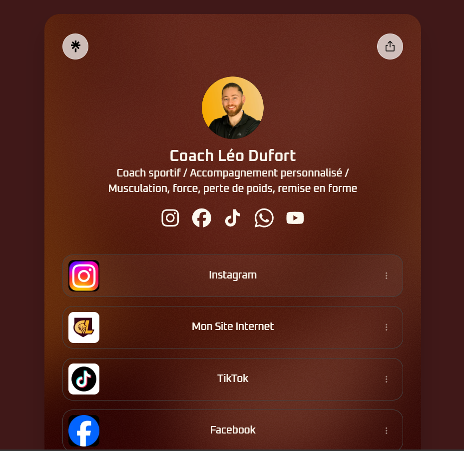 Retrouvez ici tous mes liens officiels : réseaux sociaux et contenus. Un seul espace pour suivre mes activités, accéder aux ressources et me contacter facilement.