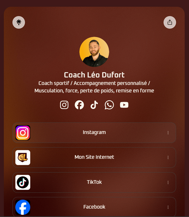 Retrouvez ici tous mes liens officiels : réseaux sociaux et contenus. Un seul espace pour suivre mes activités, accéder aux ressources et me contacter facilement.